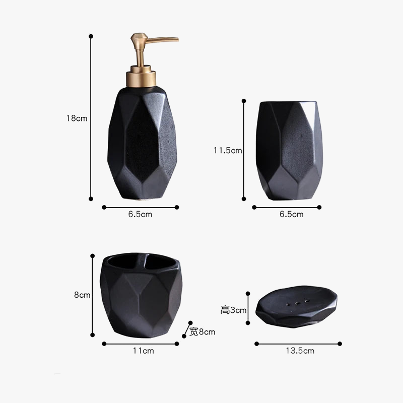 Les pièces incluent une bouteille de distribution pour le liquide, un porte-savon, un gobelet pour le bain de bouche et un porte-brosse à dents. Chaque élément de ce set est conçu pour être à la fois fonctionnel et décoratif, permettant une organisation optimale tout en ajoutant une touche de raffinement à votre espace.